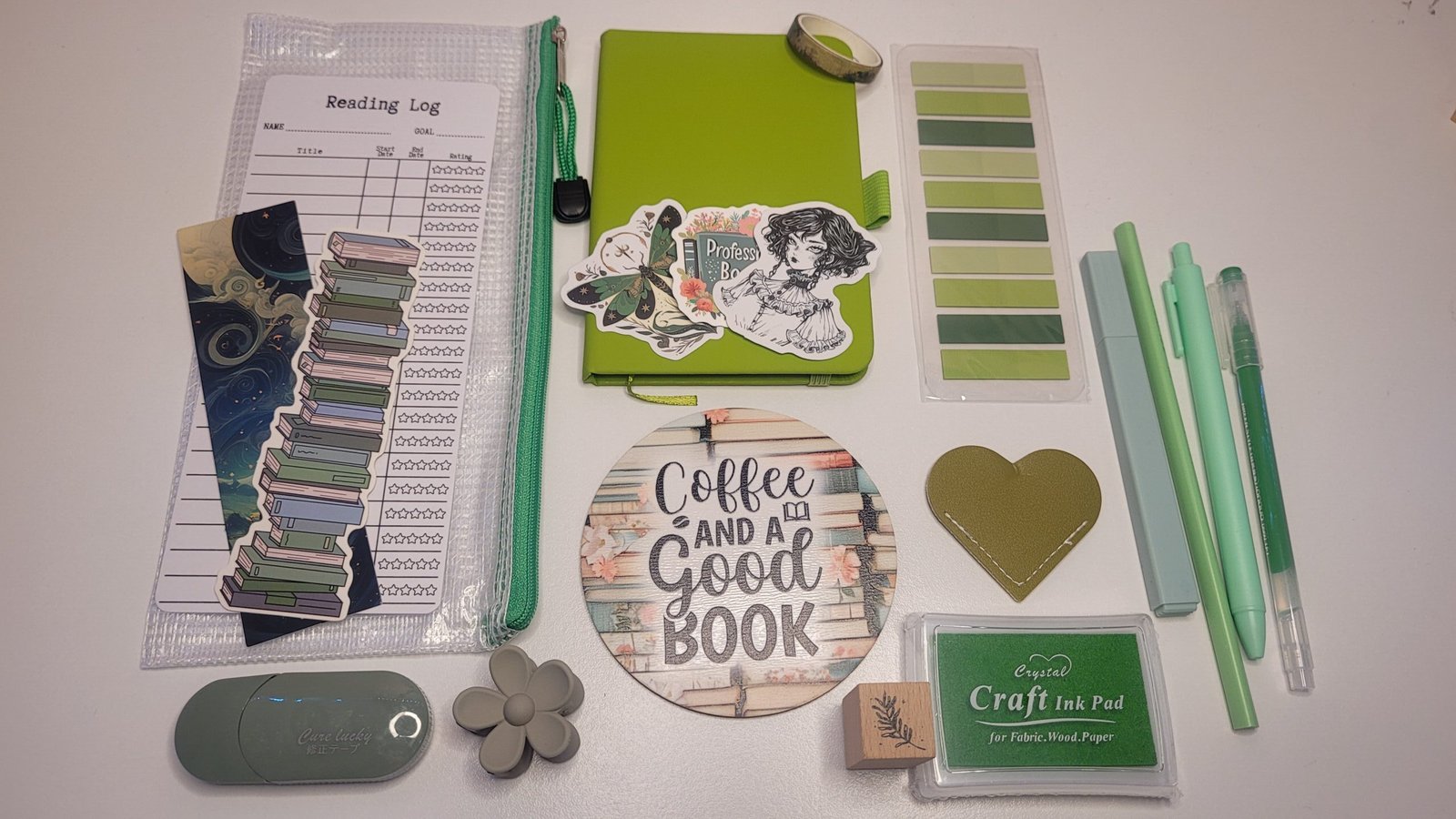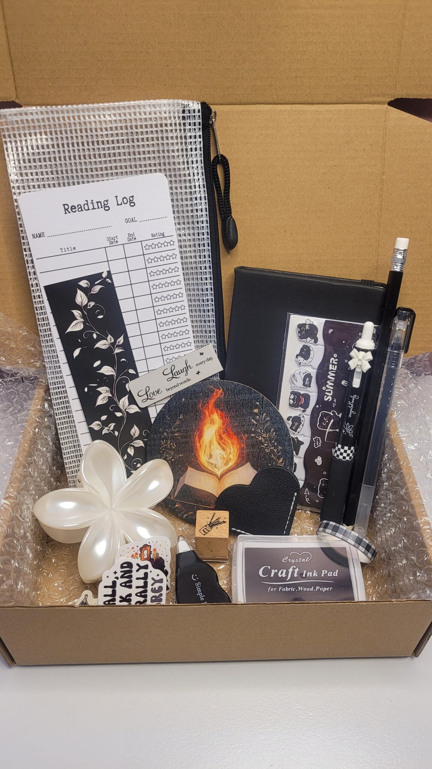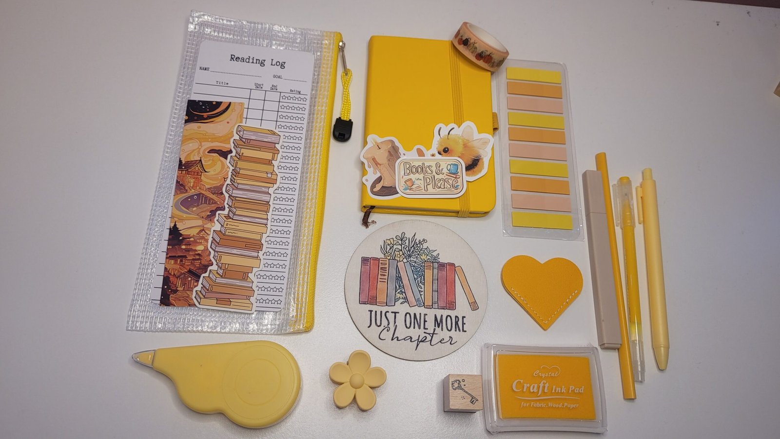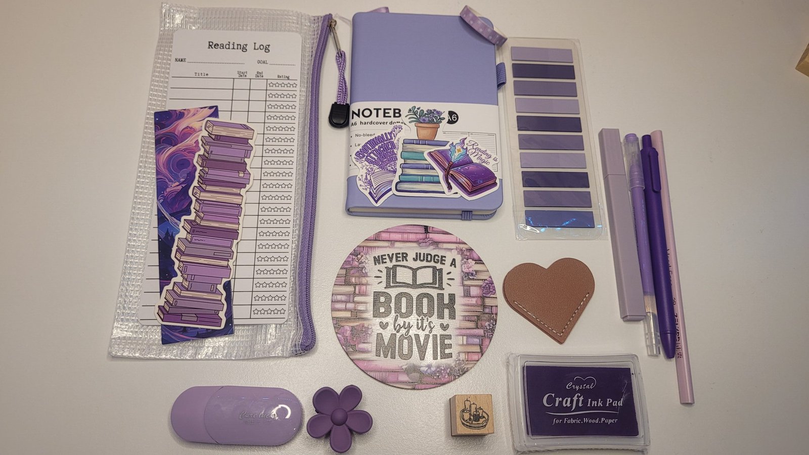 Each bundle includes a faux-leather A6 notebook, assorted stickers, bookmarks, pens, a pencil case, ink pad and stamp, a hair clip, and a drink coaster — everything you need to add a touch of creativity and charm to your reading nook or journaling space.