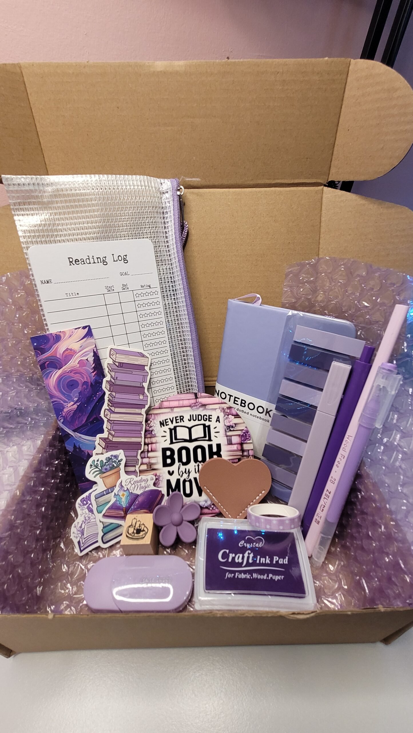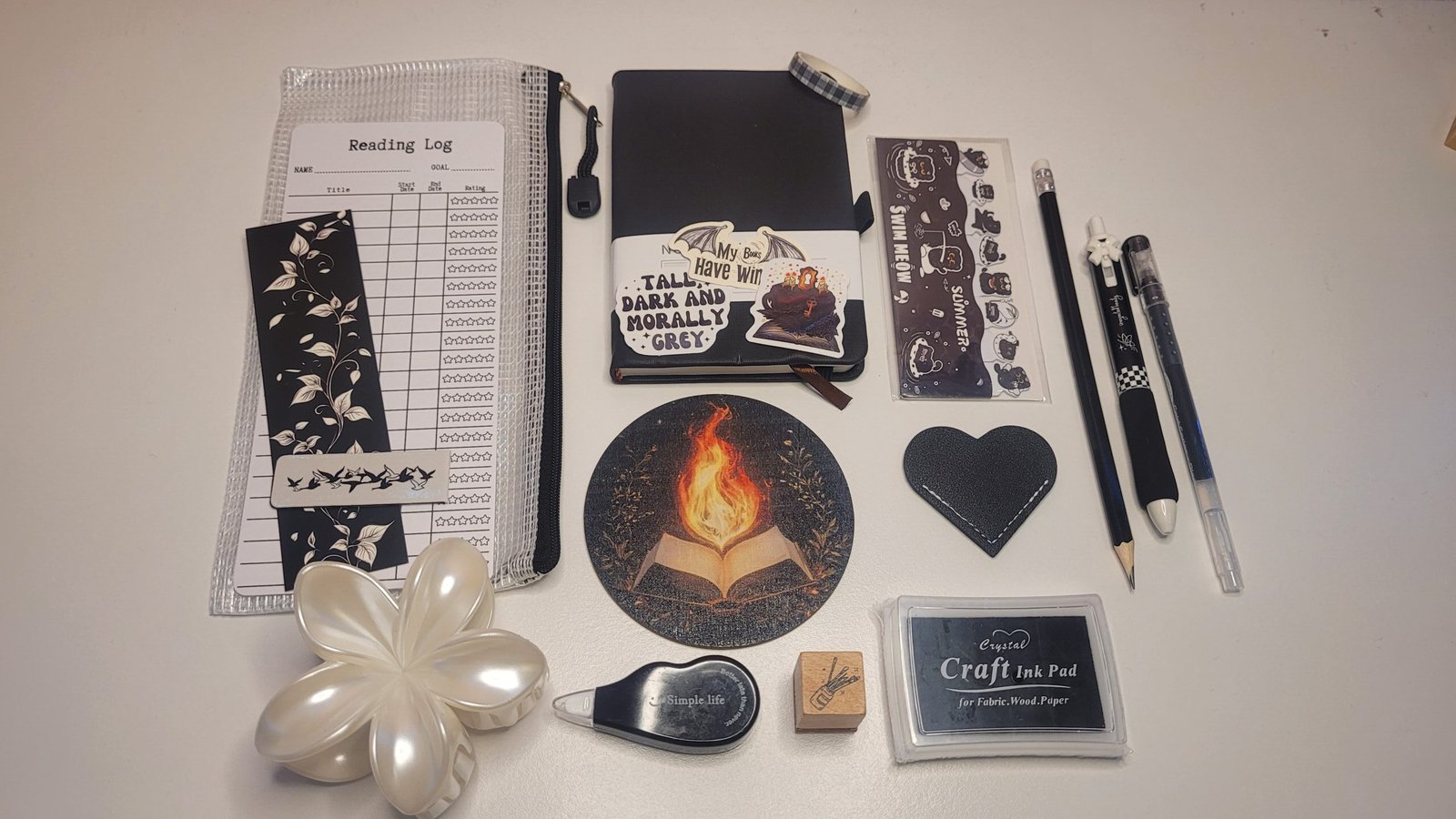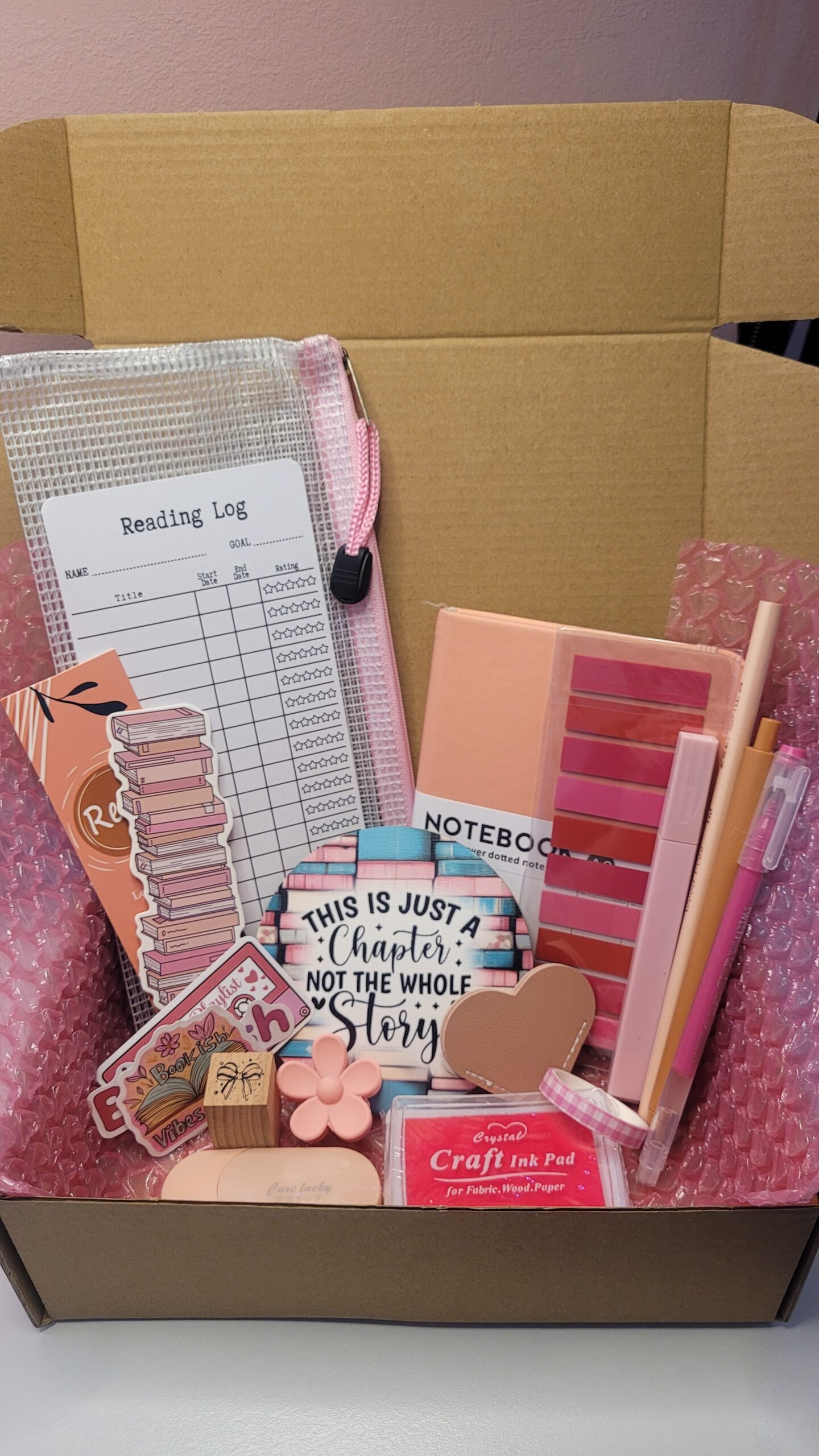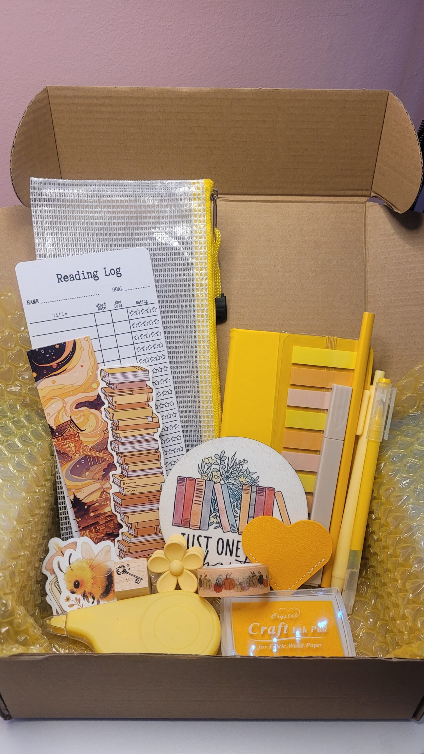 Each bundle includes a faux-leather A6 notebook, assorted stickers, bookmarks, pens, a pencil case, ink pad and stamp, a hair clip, and a drink coaster — everything you need to add a touch of creativity and charm to your reading nook or journaling space.